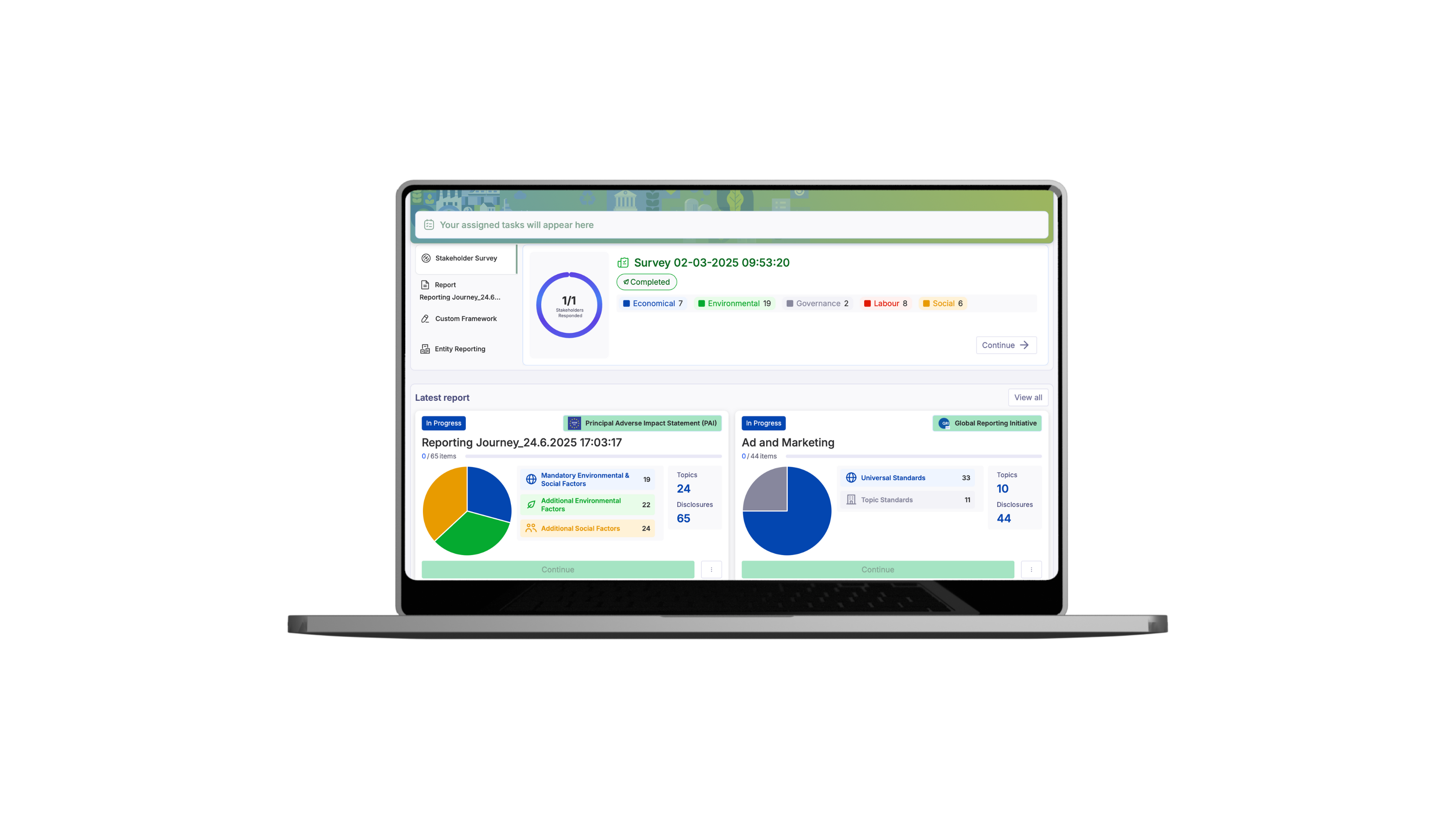 Our ESG Data Analytics Platform leverages advanced technology to generate a comprehensive ESG Report. The dashboard allows seamless tracking of your progress